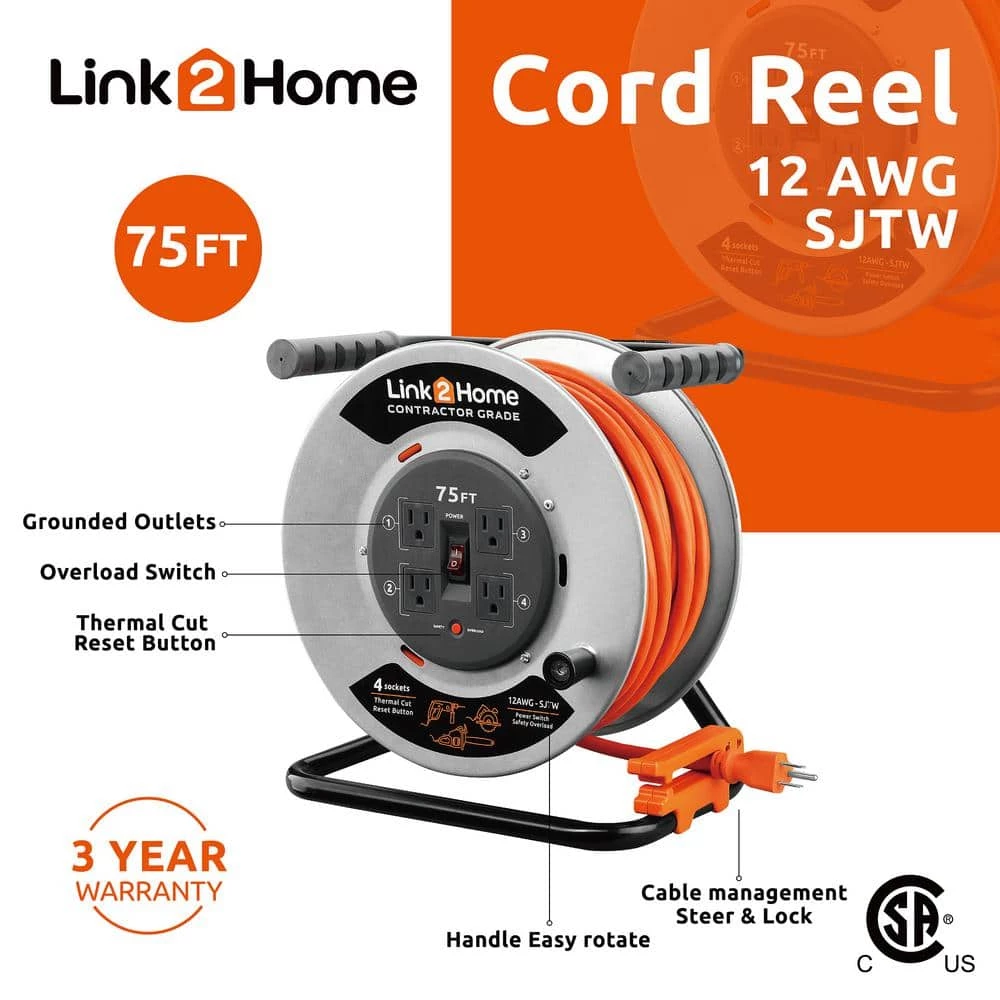 Add power to your warehouse, garage or backyard with the Link2Home Contractor-Grade Metal Cord Reel 75 ft. Extension Cord with 12 AWG SJTW Cable. The cords stay organized thanks to the reel with a heavy-duty handle and the cord-locking system keeps them safely in place. It’s easy to spot with a high-visibility design and it’ll last you over time with a durable metal frame.