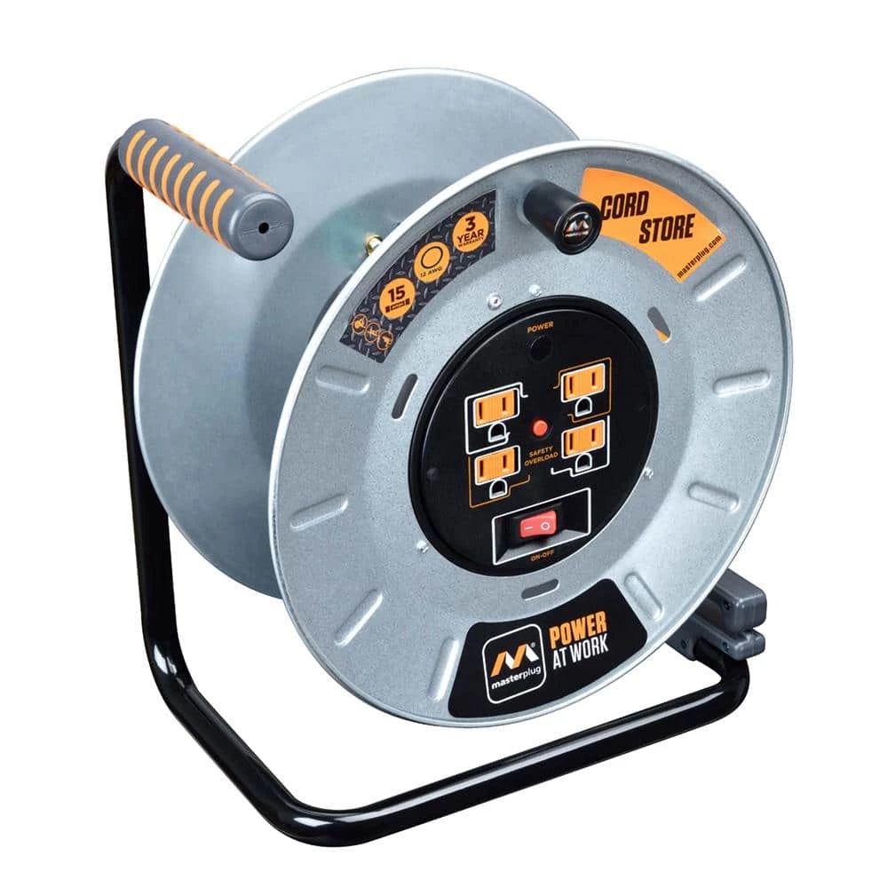 - Masterplug Pro-XT 4 outlet open cord reel extension lead with high vis 14AWG cord, easy winding handle and integrated cord guide