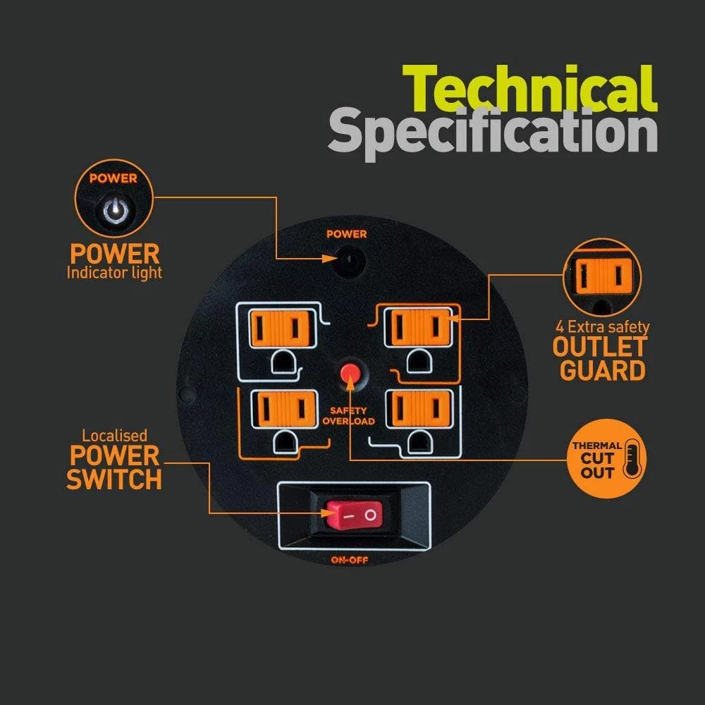 - Integrated over current protector, which is in the front center of the cord reel, prevents the reel from being overloaded when in use