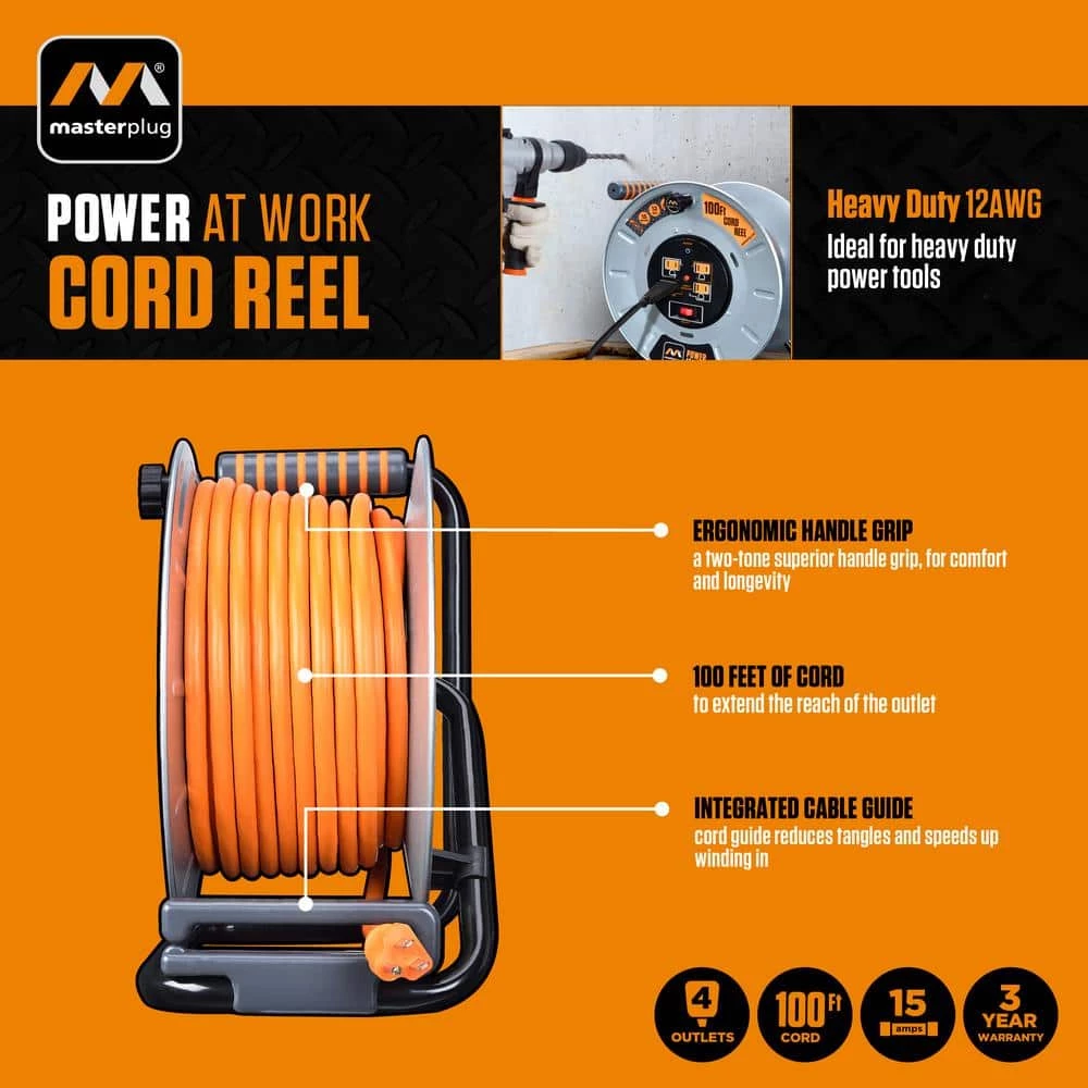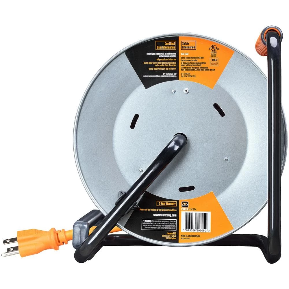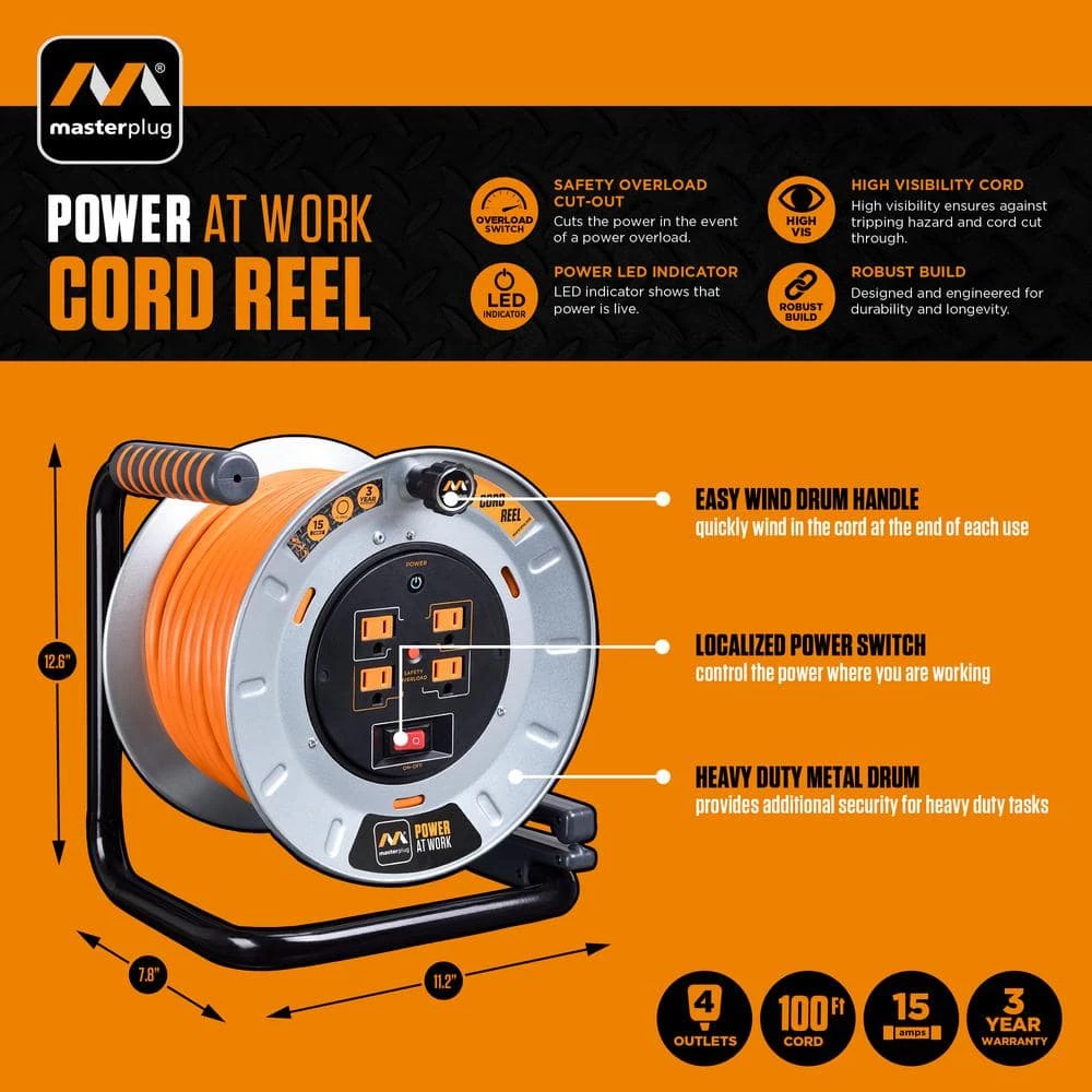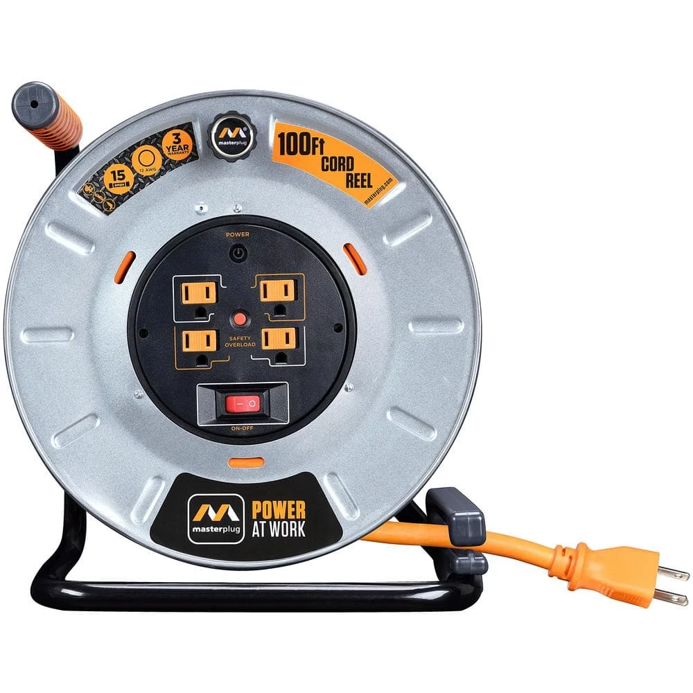 - Masterplug ProXT 4 outlet open cord reel extension lead with high vis 14 AWG cord, easy winding handle and integrated cord guide