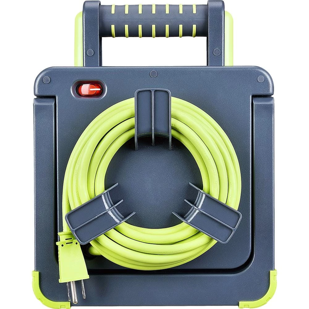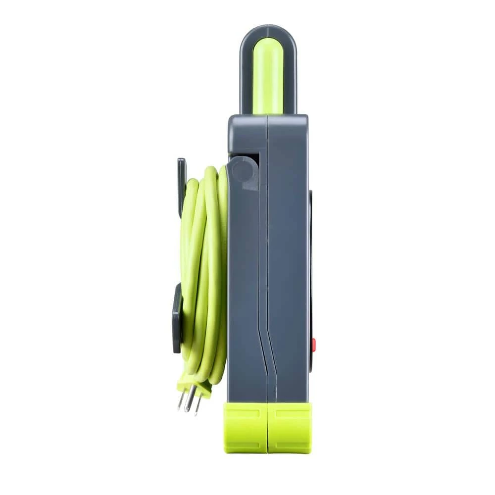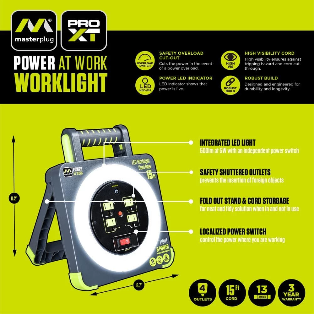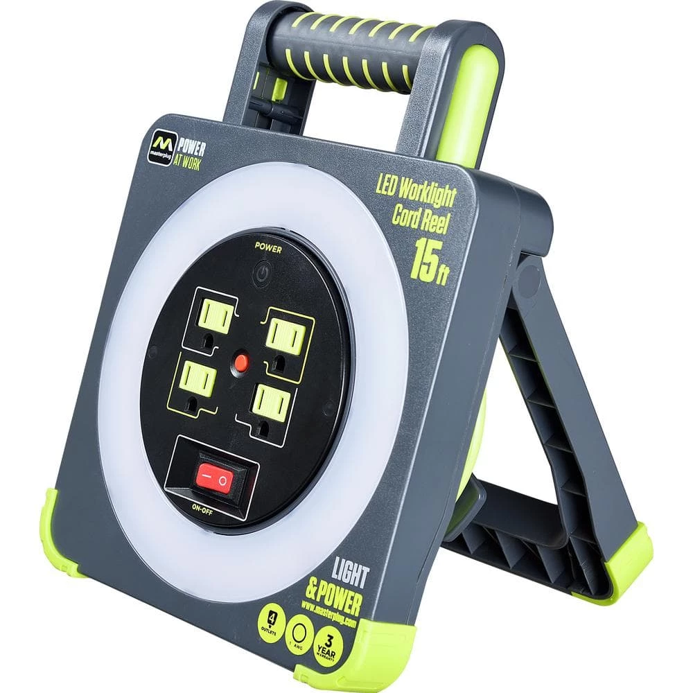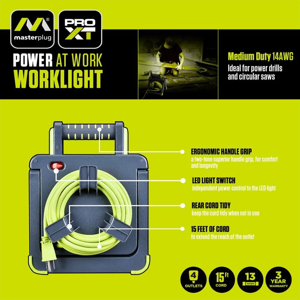 A portable work light with 15 ft. of highly visible cord, providing light and power for home and yard. This handy worklight provides 500 Lumens of light power, as well as 4 shuttered outlets with power control and status indicator where you are working. Designed and engineered for longevity, the work light has a fold out stand and ground touch points have grips to ensure stability.