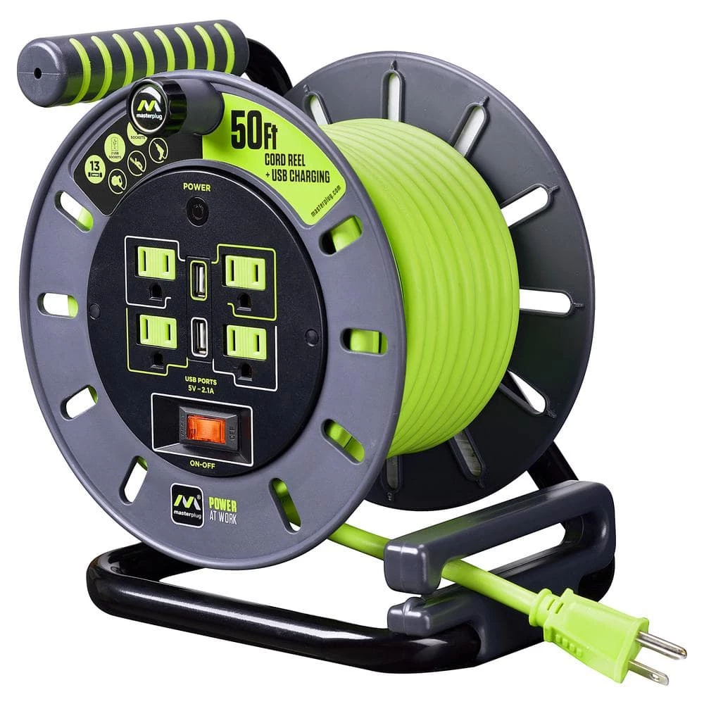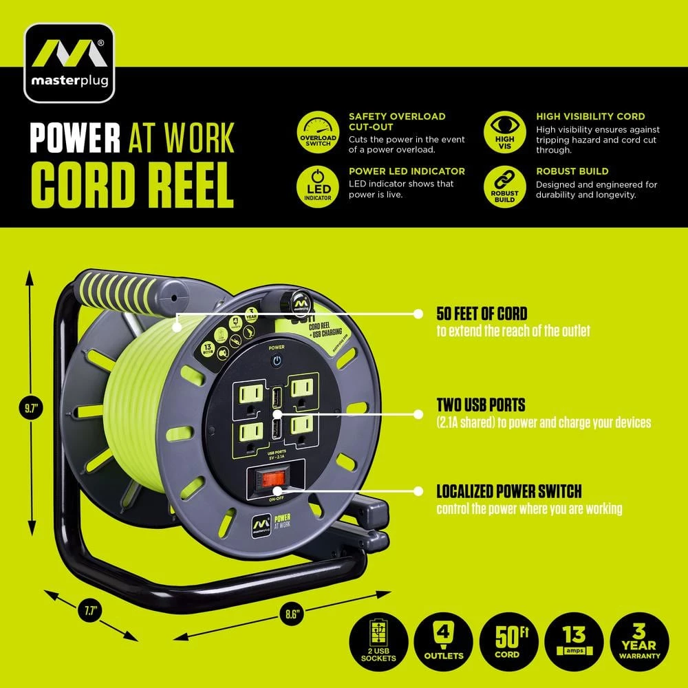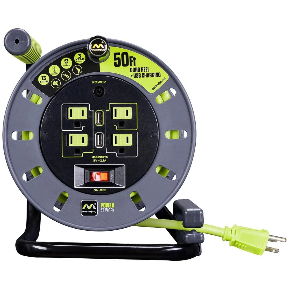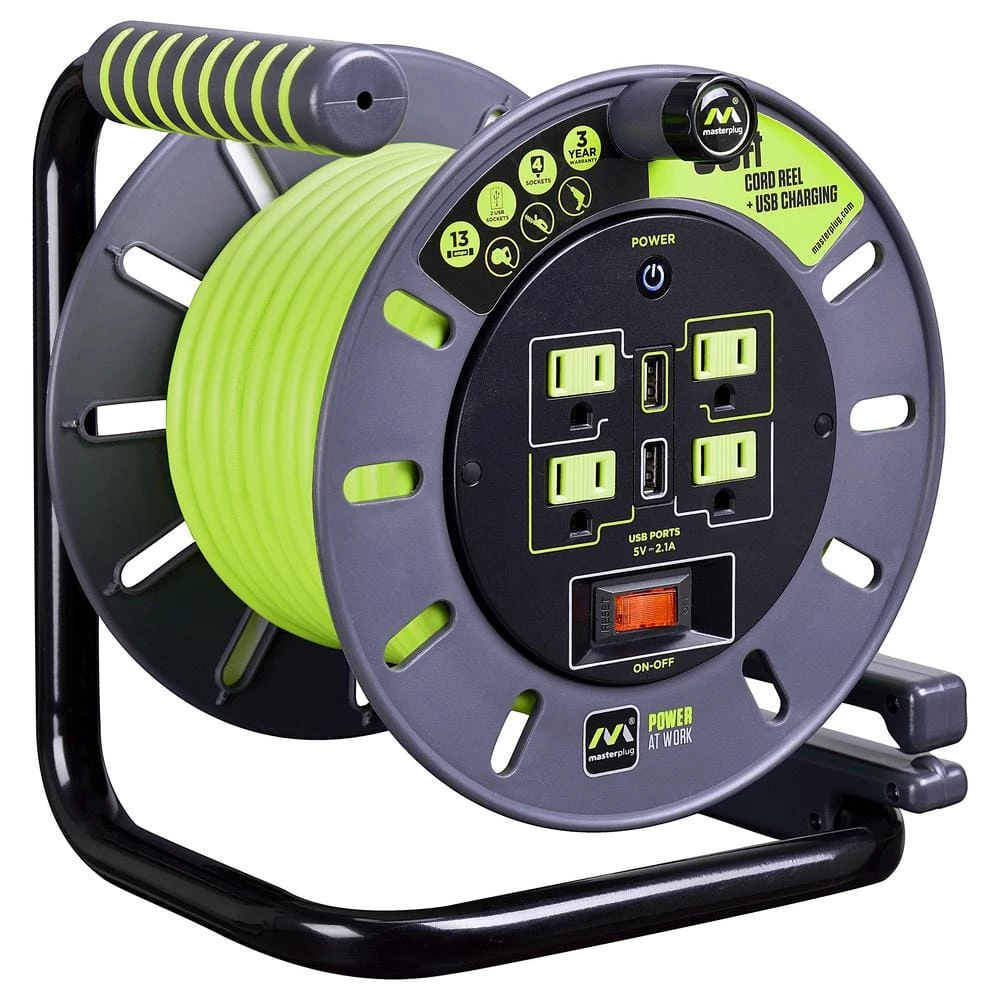 - Masterplug Pro-XT 4 outlet open cord reel extension lead with high vis 14 AWG cord, easy winding handle and 2 integrated USB charging ports