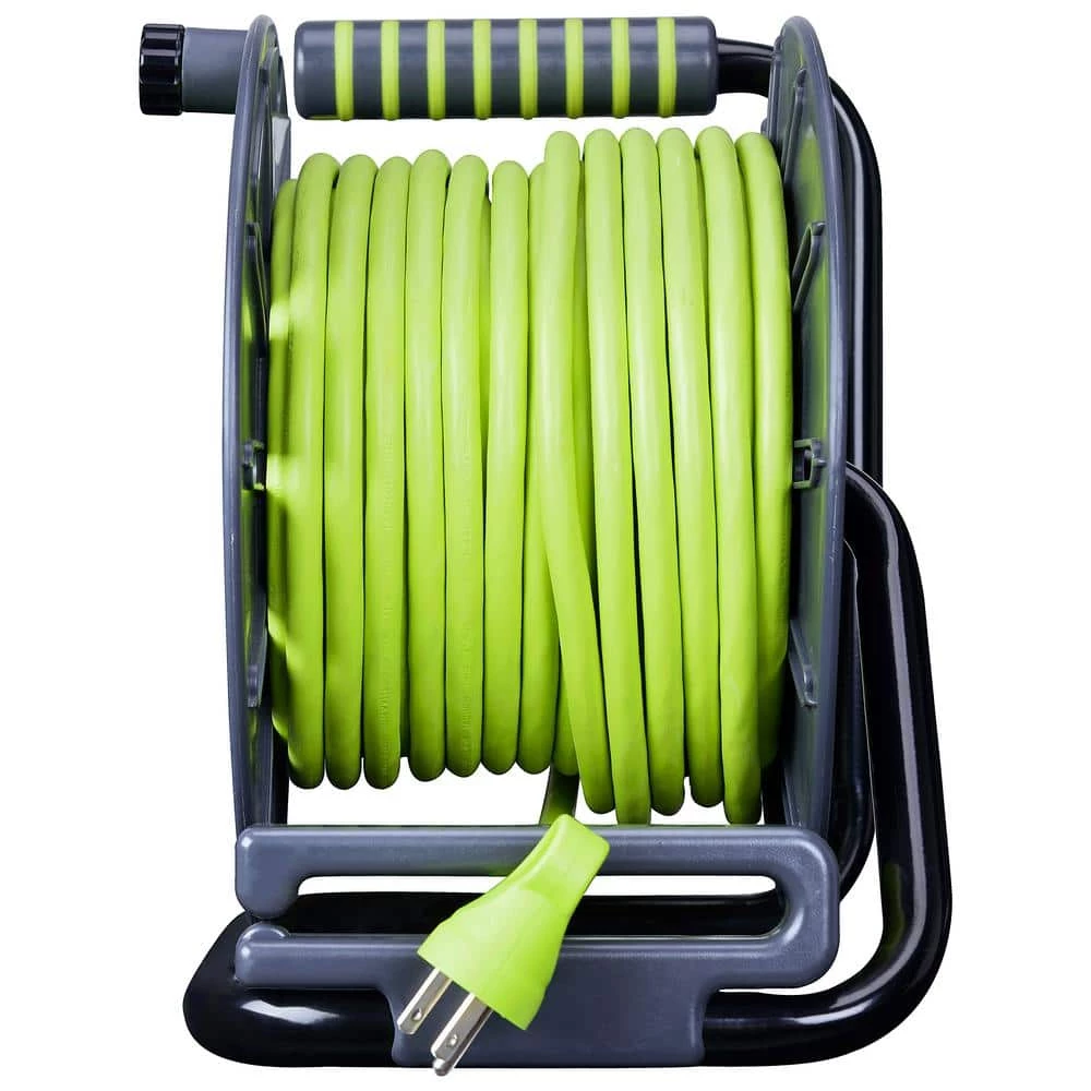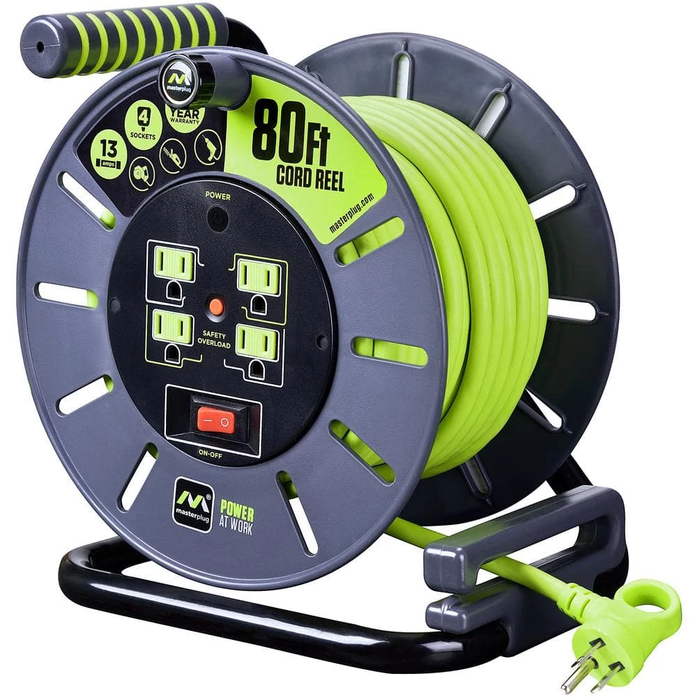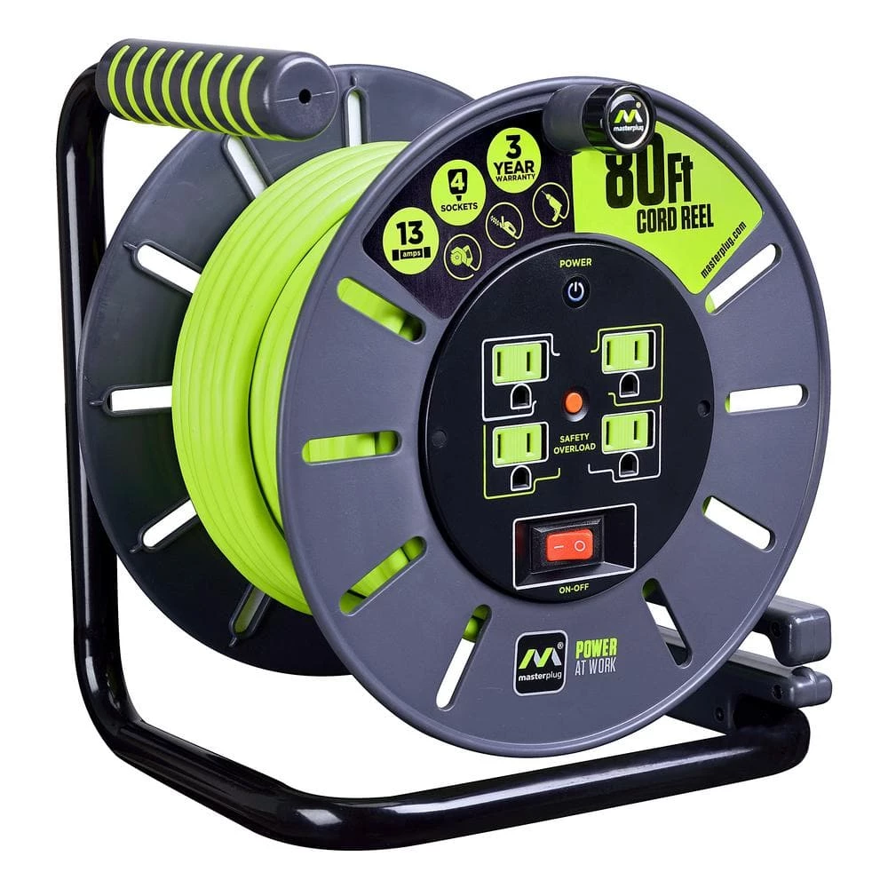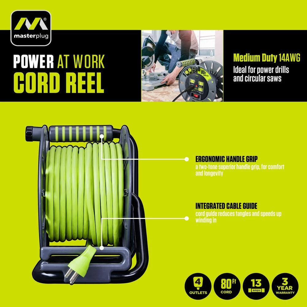 - Masterplug ProXT 4 oulet open cord reel extension lead with high vis 14 AWG cord, easy winding handle and intergrated cord guide