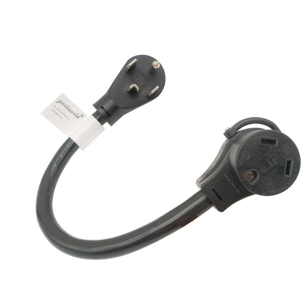 PARKWORLD brand #60486 1.5 ft. Heavy-Duty 30 Amp 125-Volt NEMA 14-30P to TT-30R Power Adapter Cord. This adapter will let you connect any appliance having a RV/Travel Trailer/Generator NEMA TT-30 plug, to your dyer 4-Prong NEMA 14-30 wall outlet. It has a 3-Prong 30 Amp 125/250-Volt 10-30P male plug and a 20 Amp 250-Volt 6-20R/15R T-Blade female connector. It uses UL STW 10AWG/3C stranded wire, 100% copper conductor for heavy-duty performance, the PVC jacket ensures that cable can be used in all weather conditions.