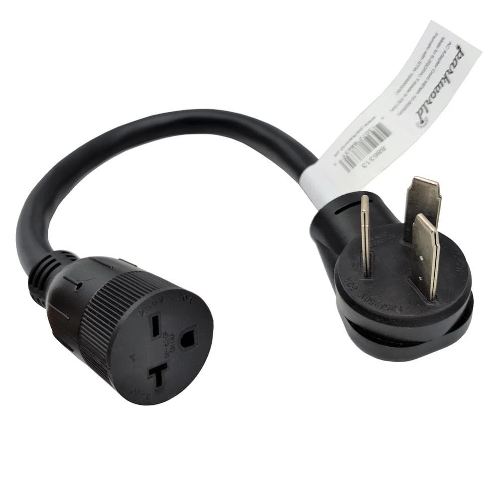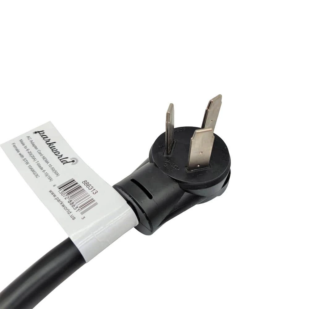 PARKWORLD brand #886313A 1.5 ft. 20 Amp 250-Volt NEMA 10-50P to 6-20R/15R Power Adapter Cord. This adapter cord will let you connect any appliance having a 3-Prong NEMA 6-20P or a 6-15P plug to your 50 Amp NEMA 10-50 wall outlet. It has a 50 Amp 125-Volt/250-Volt 3-Prong 10-50 male plug and a 20 Amp 250-Volt 3-prong 6-20R/15R T-Blade female Connector. It uses UL STW 10AWG/3C stranded wire, 100% copper conductor for heavy-duty performance, the PVC jacket ensures that cable can be used in all weather conditions.