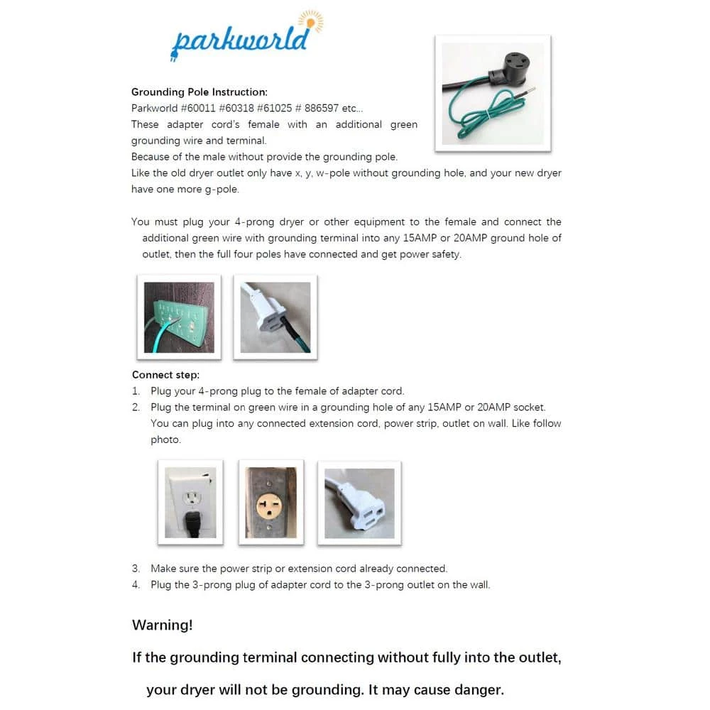 PARKWORLD brand #61025 1.5 ft. NEMA 10-50P to 14-30R Power Adapter Cord with an additional 5 ft. Grounding wire. This unique dryer adapter will let you connect any appliance having a new dryer NEMA 14-30 plug to your old dryer/electric ranges NEMA 10-50 wall outlet built before 1997. It has a 50 Amp 125/250-Volt 3-prong dryer NEMA 10-50P male plug and a 30 Amp 125/250-Volt 4-prong dryer 14-30R female connector. It uses UL STW 10AWG/3C stranded wire, 100% copper conductor for heavy-duty performance, the PVC jacket ensures that cable can be used in all weather conditions.