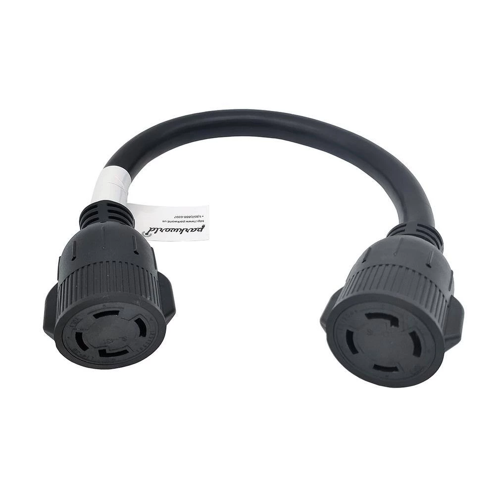 PARKWORLD brand #68345 1.5 ft. 30 Amp 125/250-Volt Generator female to female NEMA L14-30R to L14-30R Dual Plug-in Outlet Adapter. This adapter will let you connect any appliance having a NEMA L14-30 power inlet to your NEMA L14-30 Transfer Switch Power Inlet Box. It features molded 30 Amp 125/250-Volt Generator 4-prong twist locking L14-30R female connector on both ends. It uses UL STW 10AWG/4C stranded wire, 100% copper conductor for heavy-duty performance, the PVC jacket ensures that cable can be used in all weather conditions.