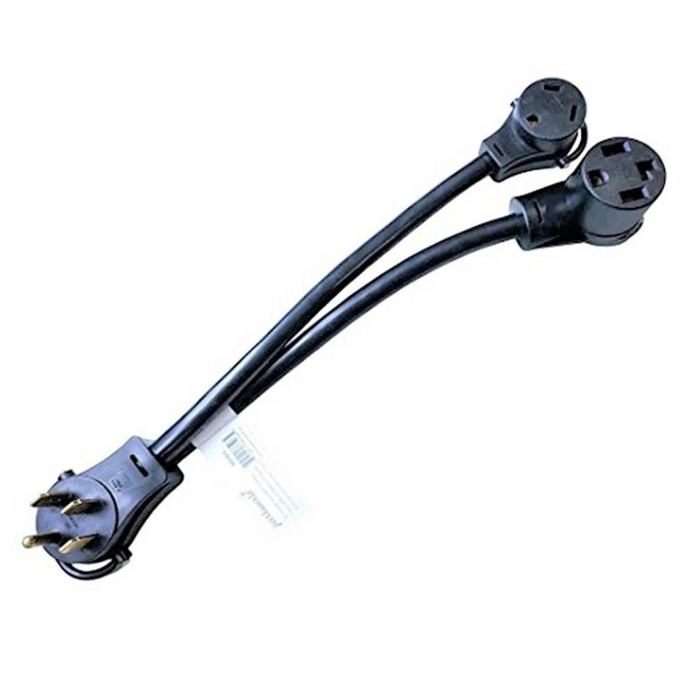 parkworld brand, #885965 1.5 ft. RV 50 Amp V Adapter Cord NEMA 14-50P to TT-30R & 14-30R V-Splitter Cord. It has a RV 50 Amp 125/250-Volt 4-Prong NEMA 14-50P male plug, a RV 30 Amp 125-Volt 3-Prong NEMA TT-30R female receptacle and a Dryer 30 Amp 125/250-Volt 4-Prong 14-30R female receptacle. Fully molded, this V-Adapter cord splits a single 50 Amp 125-Volt/250-Volt power service into two 30 Amp sockets. It gives you greater convenience and reduces wear on the electrical outlet from repeated plugging in and unplugging. CAUTION: Please make sure that the total power usage will remain below 50 amps. It’s safest to simply avoid using both appliances at the same time.