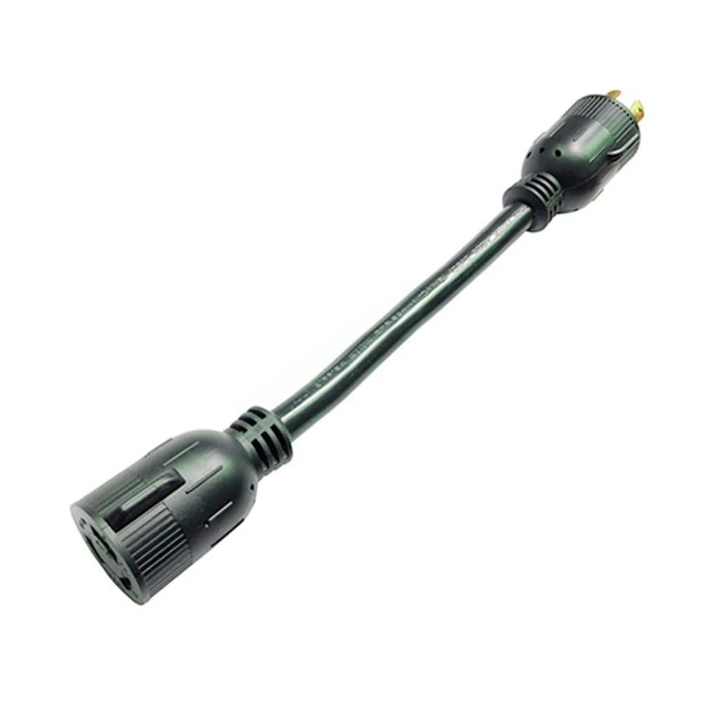 Parkworld brand #885118 1 ft. 30 Amp 250-Volt NEMA L14-30P to L6-30R Power Adapter Cord. This adapter will let you connect any appliance having a locking NEMA L6-30 plug to the generator 4-prong Locking NEMA L14-30 wall outlet. It has a Generator 4-Prong Locking 30 Amp 250-Volt NEMA L14-30P male plug and a 30 Amp 250-Volt L6-30R female connector. It uses UL STW 10AWG/3C stranded wire, 100% copper conductor for heavy-duty performance, the PVC jacket ensures that cable can be used in all weather conditions.
