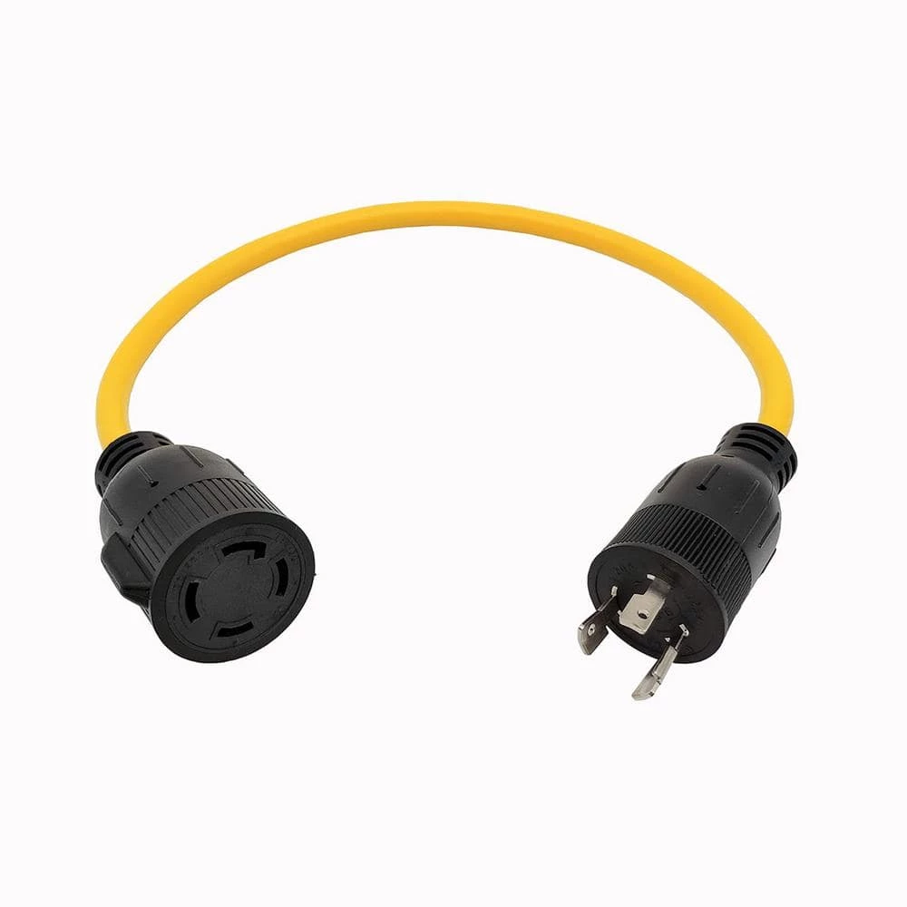 Parkworld brand #61018 2 ft. 20 Amp 125-Volt NEMA L5-20P to L14-30R Power Adapter Cord. This adapter will let you connect any appliance having a 30 Amp 4-Prong Locking NEMA L14-30 plug to a 20 Amp 3-Prong Locking NEMA L5-20 wall outlet. It has a 20 Amp 125-Volt 3-Prong Locking L5-20P male plug and a 4-prong Locking 30 Amp 125/250-Volt L14-30R female connector. It uses UL SJTW 12AWG/3C stranded wire, 100% copper conductor for heavy-duty performance, the PVC jacket ensures that cable can be used in all weather conditions.