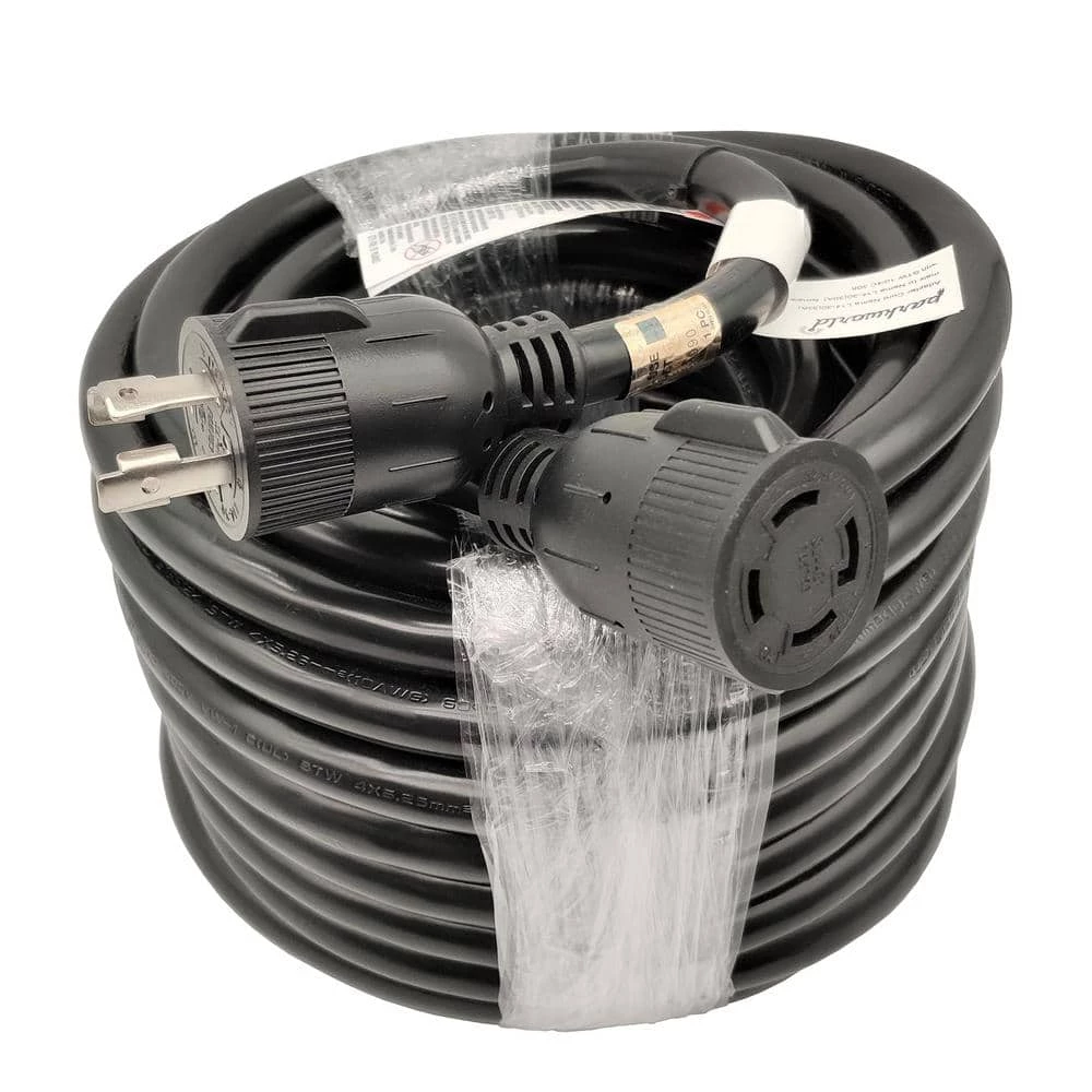 PARKWORLD brand, #692293 50 ft. Heavy-Duty 4-Prong Locking NEMA L14-30 Generator/Transfer Switch Power Extension Cord. It has a 4-Prong Locking 30 Amp 125-Volt/250-Volt L14-30P male plug and a L14-30R female connector. This extension cord is UL and cUL Listed, it will let you connect the emergency portable generators to your 30 Amp house transfer switch or power inlet box, which is great for home emergency power system applications. It uses UL STW 10 AWG/4C stranded wire, 100% copper conductor for heavy-duty performance, the STW jacket ensures that cable can be used in all weather conditions.
