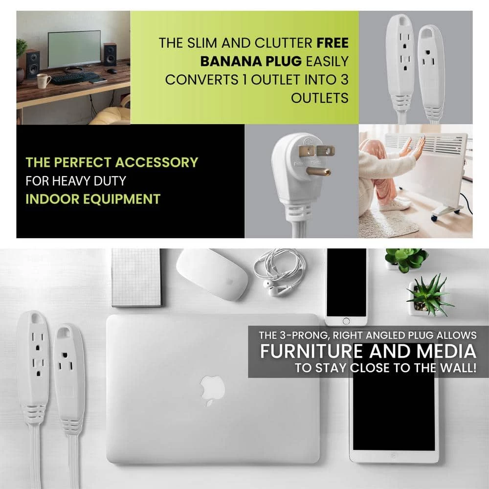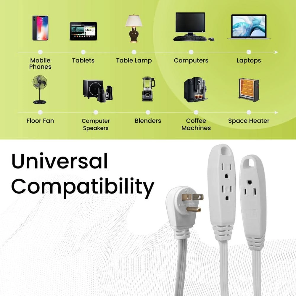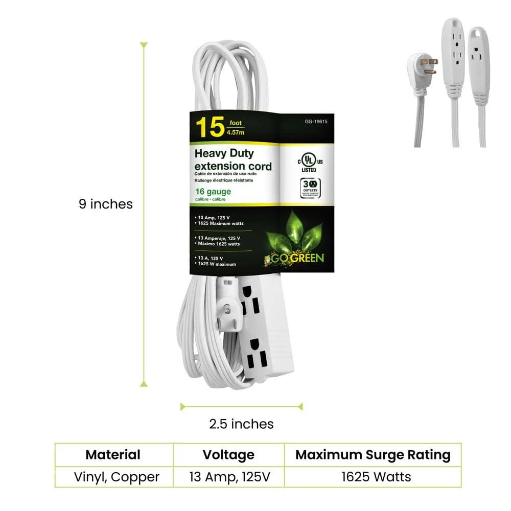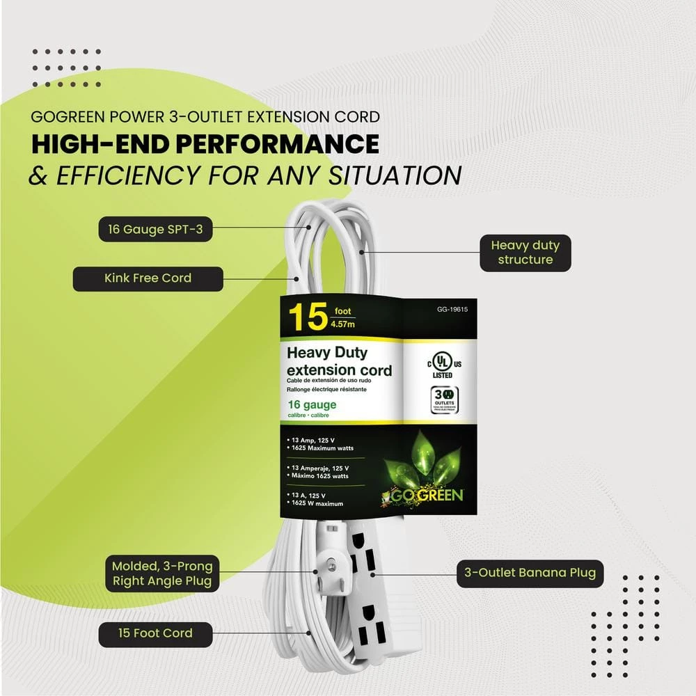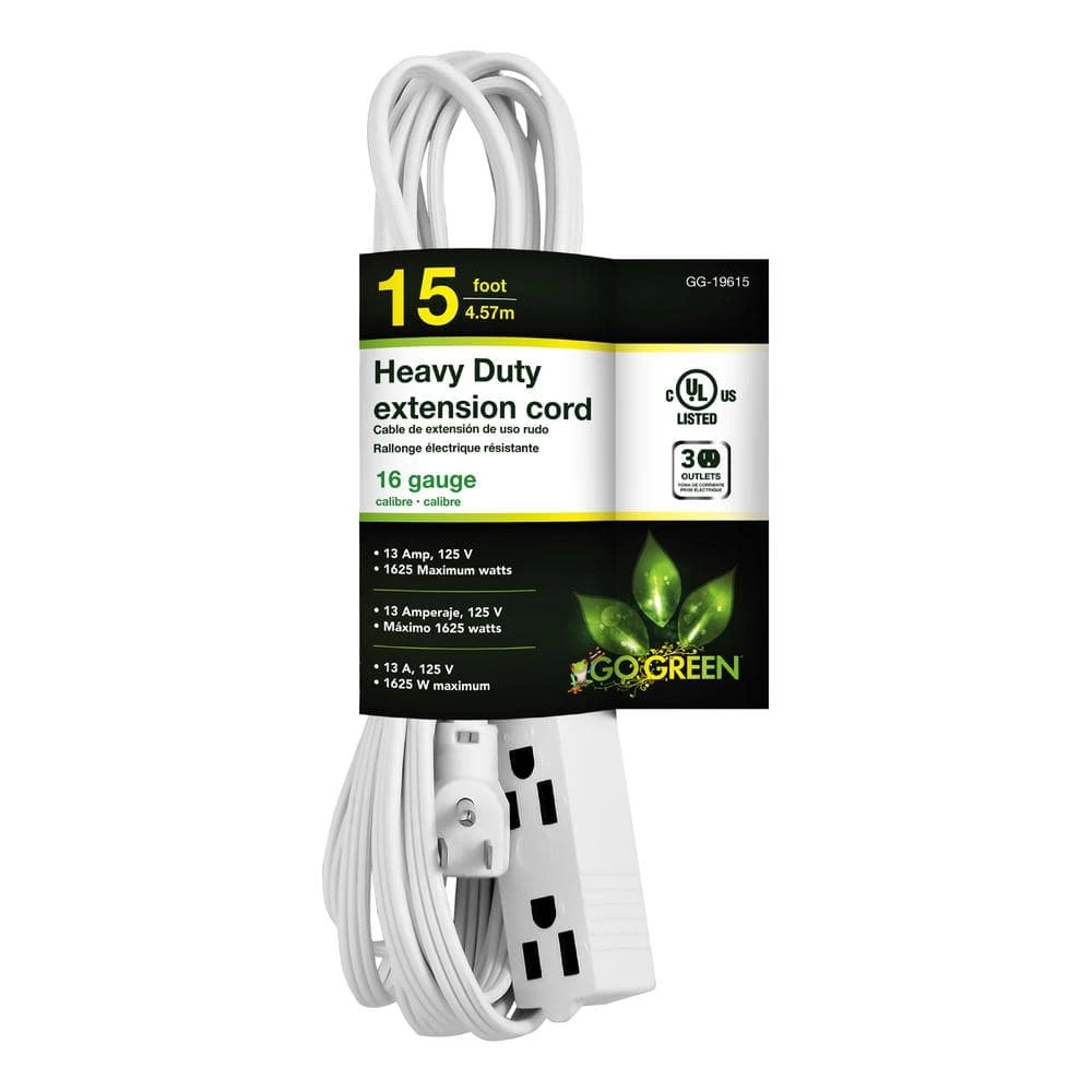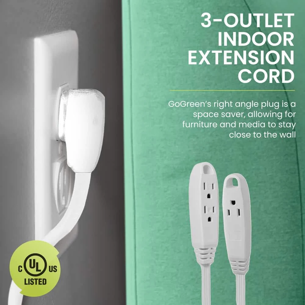 Have you ever attempted to plug in your brand new lamp on your night stand to realize the plug doesn’t reach your outlet? GoGreen’s 3-Outlet Extension Cord is exactly what you need to solve that issue! Perfect for devices such as lamps, phone chargers, fans, heaters, and many other electronics. Rated at 125 Volts, this cord can be plugged into a standard 3-prong 120V AC outlet. The 16 gauge kink-free cord is safe and reliable, providing superb insulation. Available in 8 and 15-foot variants, both extension cords provide a nifty right angle plug which can be plugged in behind couches, tables, dressers, etc. GoGreen offers a fully-paid recycling program at their own expense to further contribute to the GoGreen cause. Simply use the company’s dedicated website iRecycled.com to participate. Help save the planet with us, one extension cord at a time!