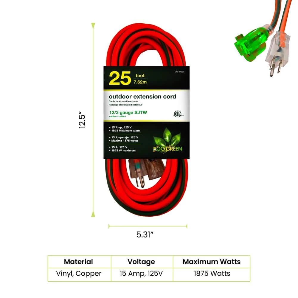 Rugged outdoor activities require a rugged extension cord capable of handling whatever project you have on your list. Whether it’s the garage, the garden, or even construction site, this one-outlet extension cord is the first, last, and best purchase you will ever make. Tracking your power usage will be the problem of the past because the lighted end tells you exactly when the power is active. Suitable for both indoor and outdoor use, this one-outlet extension cord is designed to resist moisture, abrasion, and sustained exposure to sunlight. Additionally, this item is fully ETL listed and approved as an SJTW cord, which is compliant with the rigorous standards for a hard service thermoplastic cable rated for 300 volts. GoGreen offers a fully-paid recycling program at their own expense to further contribute to the GoGreen cause. Simply use the company’s dedicated website iRecycled.com to participate. Help save the planet with us, one extension cord at a time!