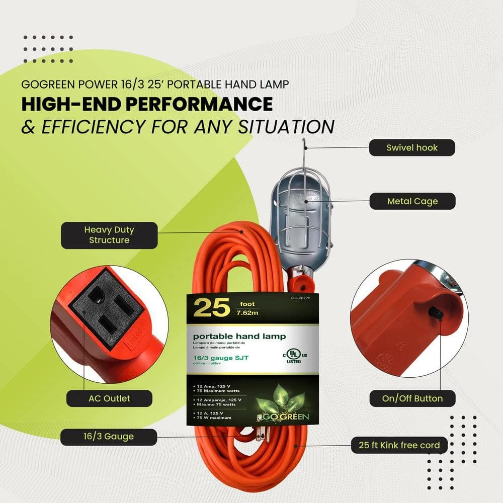 GoGreen Power portable hand lamps emit a wide range of bright light and boast an extremely long service life. As such, they’re perfect for use by construction workers and everyday household projects. Whether you’re at a construction site, in the garage, basement, or attic, these lights will brighten up a large area with east. Available with a kink-free 25 or 50-foot cord, these portable hand lamps are perfect for those hard to reach areas. The metal cage is equipped with a sturdy swivel hook, so you can hang the hand lamp virtually anywhere to free up your hands and focus on the task at hand. GoGreen offers a fully-paid recycling program at their own expense to further contribute to the GoGreen cause. Simply use the company’s dedicated website iRecycled.com to participate. Help save the planet with us, one extension cord at a time!