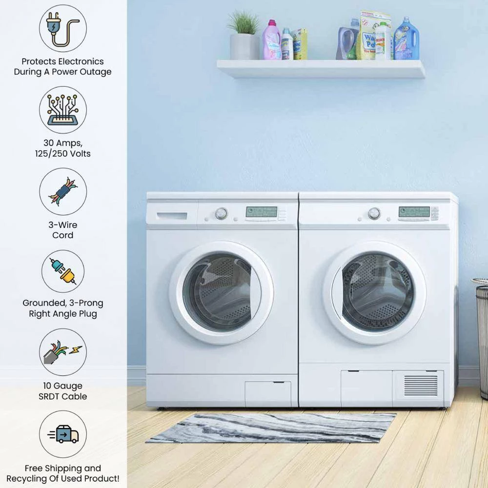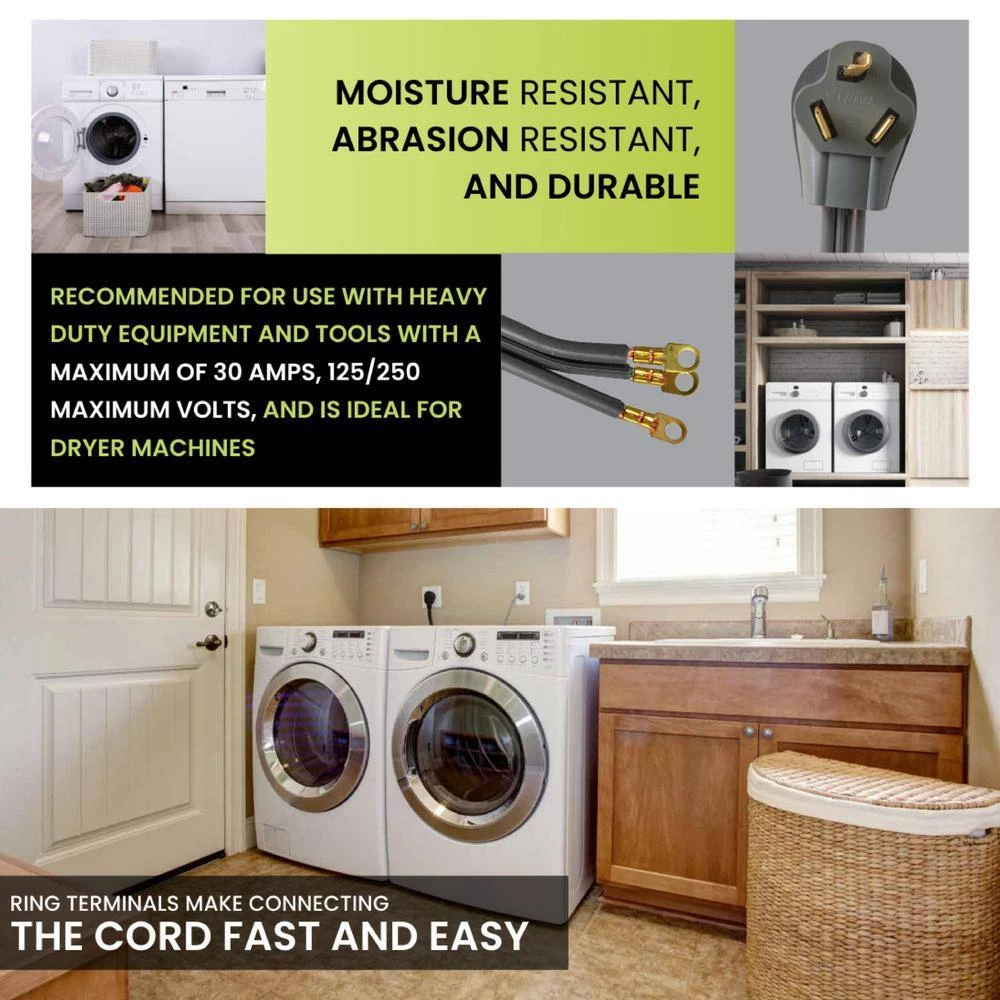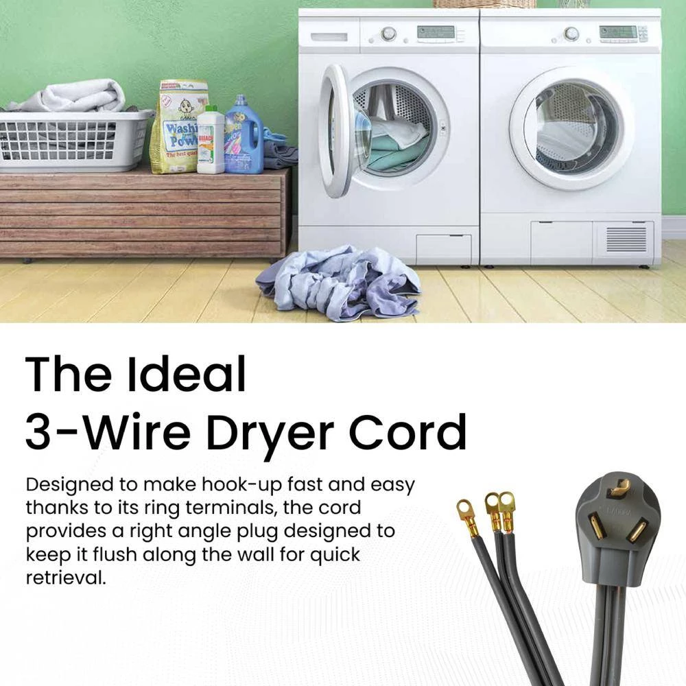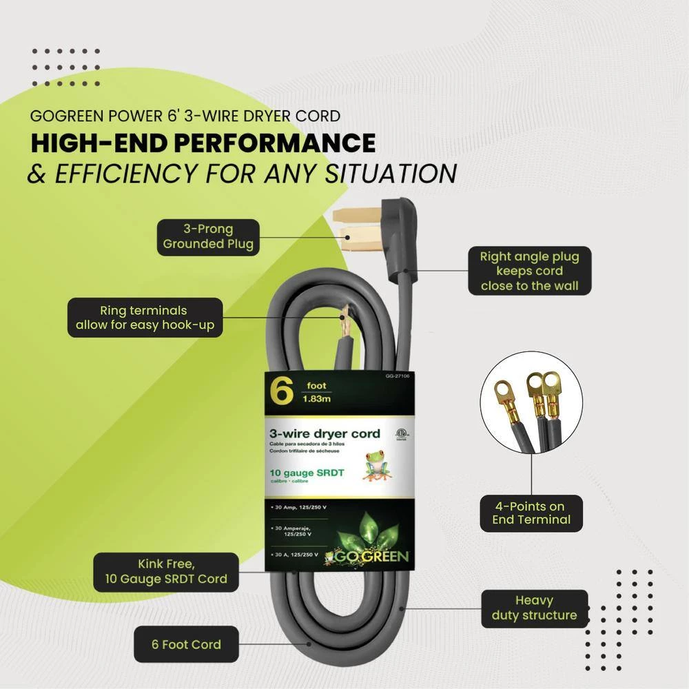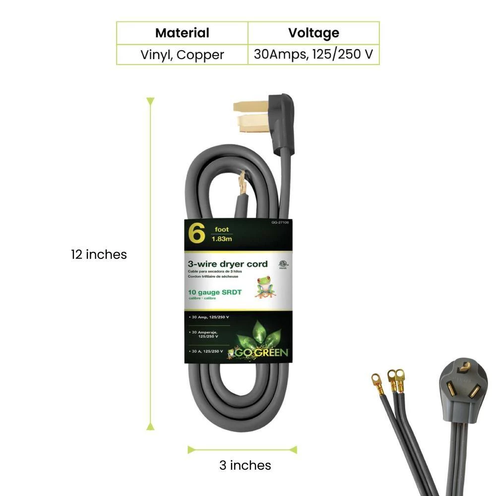 Save time, money, and energy with this ETL approved dryer cord. Available in two lengths, 4 foot or 6 foot, it works well with all brands of dryers that have a 3-prong or 4-prong outlet. Designed to make hook-up fast and easy thanks to its ring terminals, the cord provides a right angle plug designed to keep it flush along the wall for quick retrieval. This dryer cord is designed to last and to be used with 125/250V outlets. Be sure to read the dryer’s manual to learn which wire, 3 or 4, is needed to hook up the drying machine. GoGreen offers a fully-paid recycling program at their own expense to further contribute to the GoGreen cause. Simply use the company’s dedicated website iRecycled.com to participate. Help save the planet with us, one extension cord at a time!