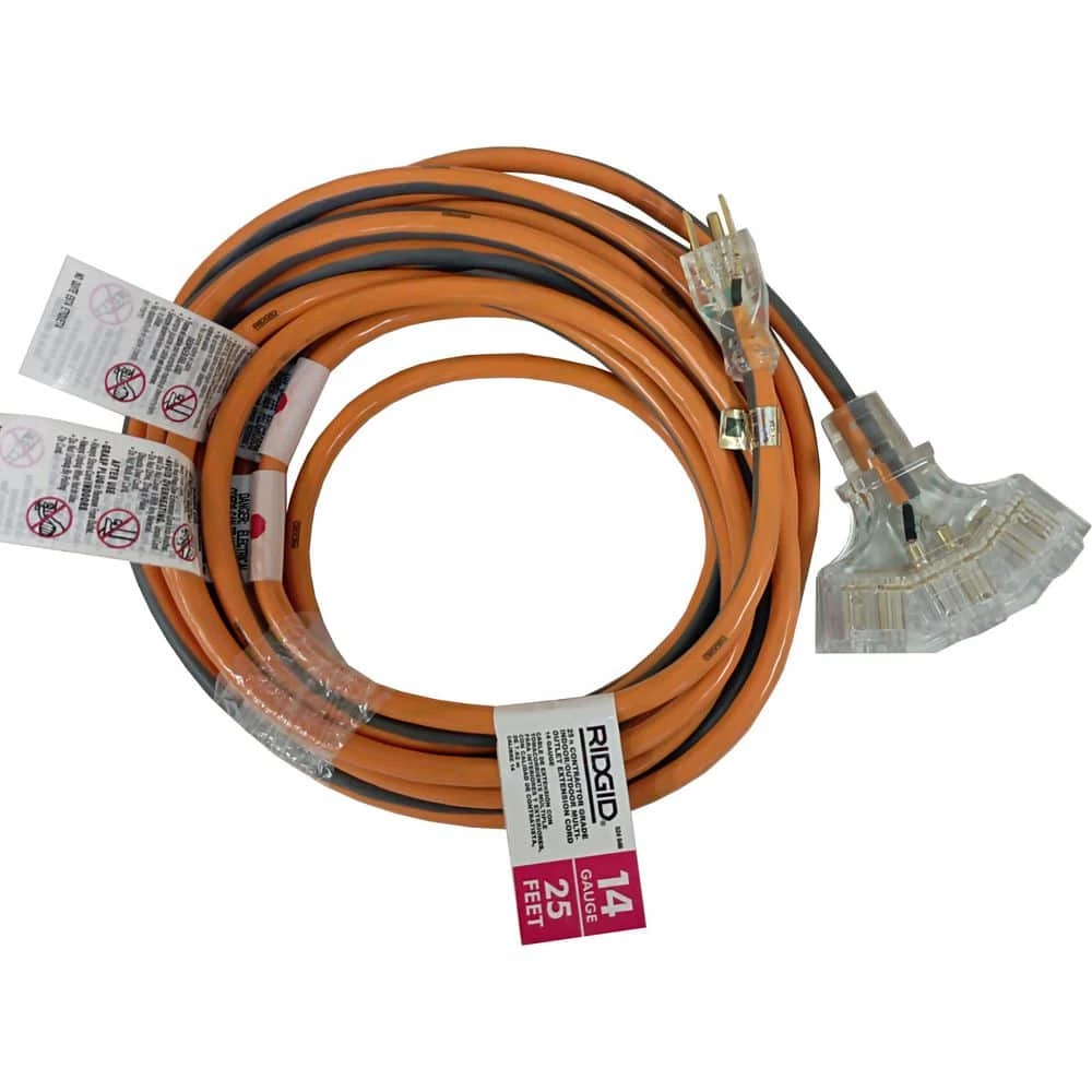 The RIDGID 25 ft. Orange and Gray 14/3 Multi-Outlet Extension Cord is ideal for providing power in indoor or outdoor applications. This extension cord offers 3 illuminated outlets for power-on indication. It has a durable strain relief to make sure the plug securely connected with cable. This cord have 15 Amp, 125-Volt, 1,875-Watt capacity.
