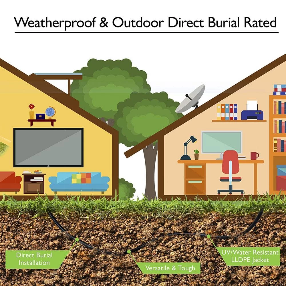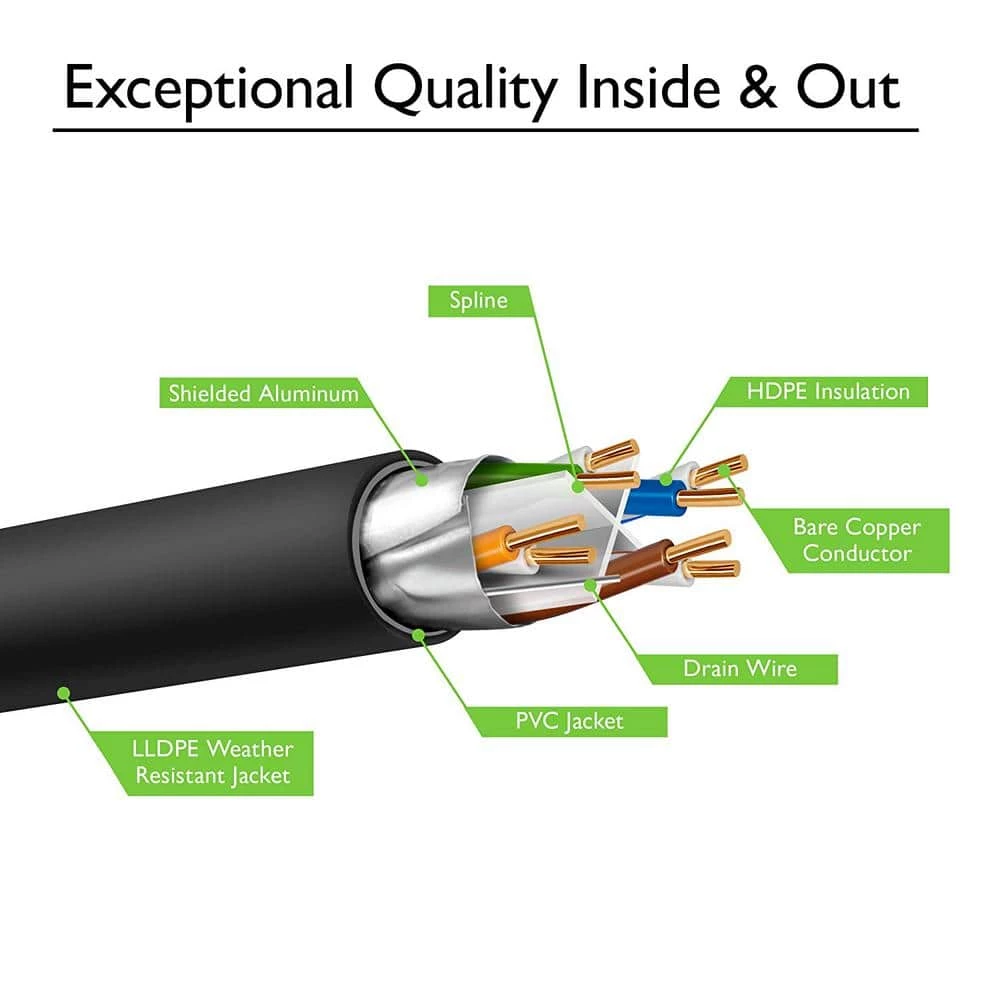 - Suitable for direct burial outdoors: ultra heavy-duty weatherproof design withstands high and low temperatures, direct UV Sunlight, rain, snow, dirt, dust, sand and other outdoor exposure for years of high-speed networking, strong, durable features include PVC waterproof jacket, RJ45 shielded connector plugs, 23 AWG BC pure copper (not CCA), FTP foil twisted pair cabling and other hardy components