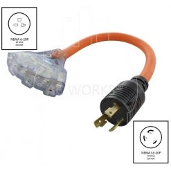 AC WORKS 1.5 ft. 30 Amp 3-Prong L6-30P Locking Plug to 6-15/20 Outlet with 20 Amp Breaker