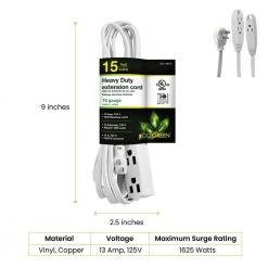 Power By Go Green 15 ft. 16/3 SPT-2, 3 Outlet Extension Cord – White