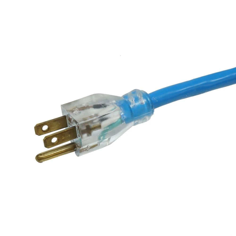 Coldflex 32678806 14/3 Heavy-Duty 15-Amp SJTW Cold Weather 3-Outlet Extension Cord, 25-Feet. Rated for -58F to 140F (-50C to 60C). ColdFlex extension cords withstand harsh, winter temperatures. HEAVY DUTY 25 foot 3-outlet all-copper wire extension cord recommended for use with heavy duty equipment and tools. HIGHLY VISIBLE bright blue jacket provides extra safety as well as prevents loss and theft on jobsites. EXTRA DURABLE oversized, clear molded plug prevent accidental bending or breaking and UL listed for your safety. LIGHTED END shows power is on and cord is ready to use.