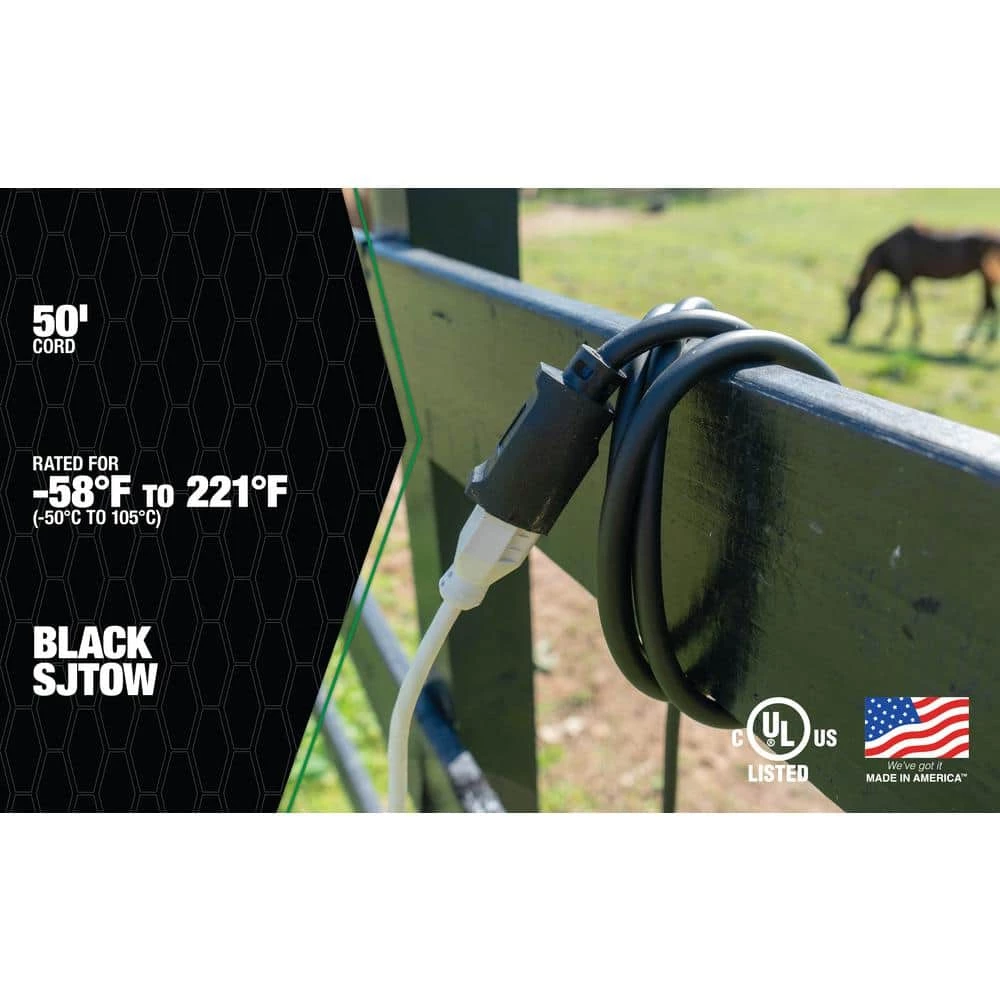 - Heavy-duty 50 ft. all-copper wire extension cord recommended for use with heavy-duty equipment and tools