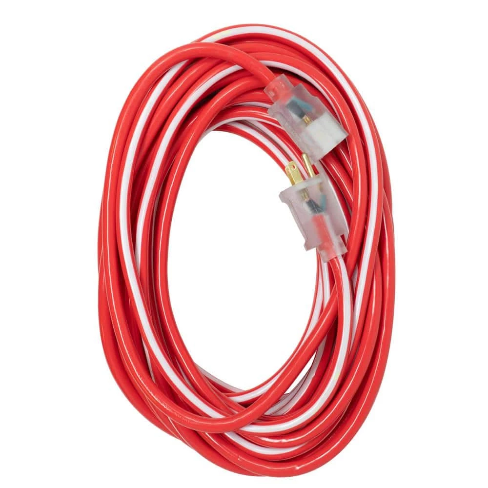 The 50 ft. 12/3 Neon Outdoor Extension Cord is bright red with white stripe it helps to increase safety awareness and help to prevent job site loss or theft with neon stripes outdoor extension cords. Every extension cord features a dominant color and an extruded colored stripe that runs the length of the cord. All of the stripe extension cords have a power indicator light in the receptacle to show that the power is on. Each is extension cord is rated at 15 Amp 125-Volt and wiring size is 12-Gauge with 3 conductors.