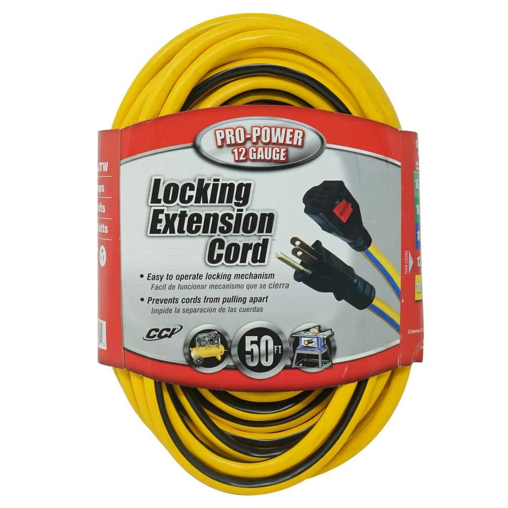 25388828 12/3 Push-Lock SJTW Locking Extension Cord, Yellow/Black, 50 ft. Rated to 15 Amp. Locking extension cords have locking plugs that keep tools plugged in. eliminating the frustration of tools coming unplugged. Perfect for the jobsite when you’re moving around. Nail guns for example are used on the move and you would never want it to become unplugged in action. The reinforced blades are added for durability. Heavy-Duty Strain relief protects electrical connections resulting in longer cord life. SJTW construction with a PVC jacket is weather and water resistant. We recommend this cord for indoor and outdoor use with drills, hammer drills, circular saws, wet/dry vacs, lawn mowers, air compressors and more. Most commonly used in residential and commercial construction, institutional and entertainment industries.