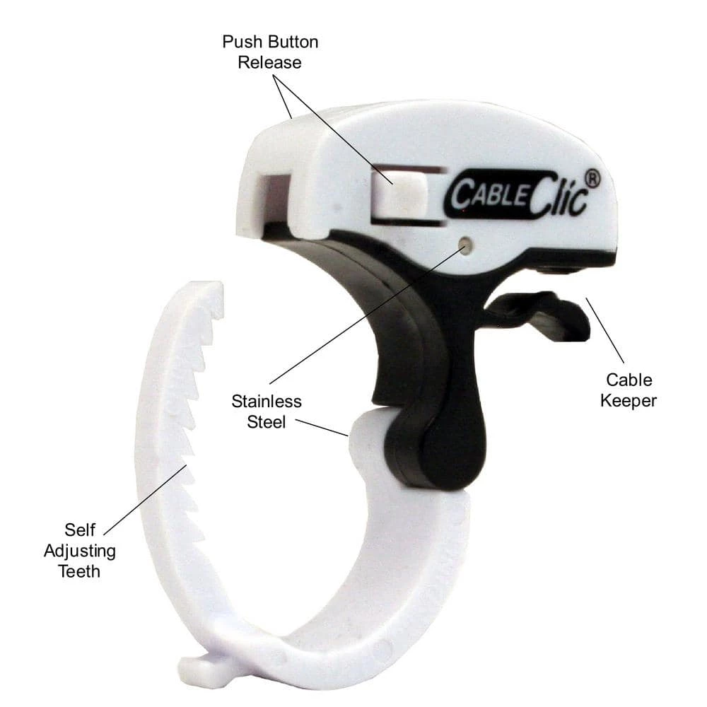 Micro Cable Clics are reusable and adjustable cable management solutions for use with earphones, chargers, personal electronics, small appliances, travel, and office accessories. The new Cable Clics feature an easy squeeze-and-release locking latch that readily opens with one hand. Constructed with durable UV resistant polymers and stainless steel the Cable Clic’s pivoting arm moves in a unique arc offering abundant space to collect and unbundle cables and cords. Its integrated ”Cable Keeper” provides a convenient attachment point. Cable Clics combine design, function, and durability producing compact devices perfect for organizing personal electronics and small cables. The micro Cable Clic is for organizing bundles from 13/32 in. to 5/8 in.