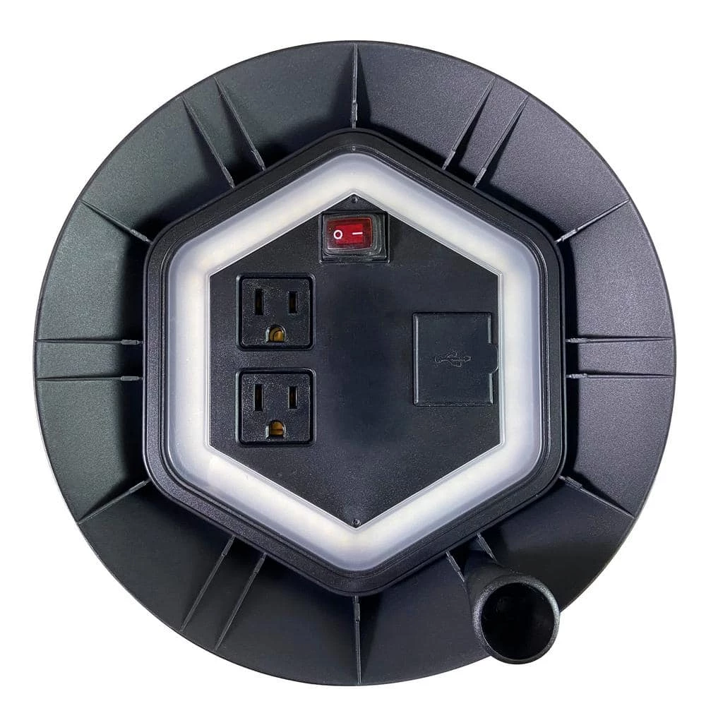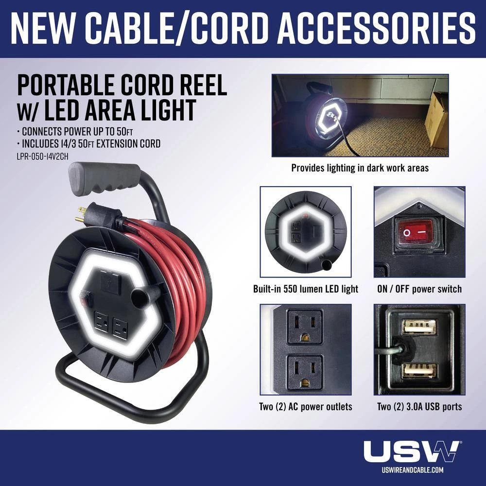 Whether it’s for your personal work garage or a jobsite, USW cord reel is the ideal power station to keep your small appliances, electrical devices or tools connected. Attached to the cord reel is a 14/3, 50 ft. extension cord and a built-in LED area light. The flush-mounted area light can produce 550 Lumens which are perfect for dark or confined spaces. in the middle of the drum reel, there are 2 grounded outlets and 2 USB ports. The drum reel is constructed with durable, scratch-resistant PVC while the handle and the base are metal. The compact profile along with the easy carry handle allows you to effortlessly transport this power station from 1 area to the next. Above all, this cord reel is rated for outdoor use, providing you reliable power in damp or wet locations.