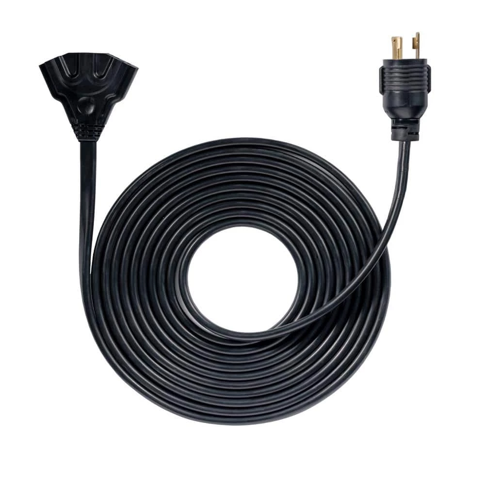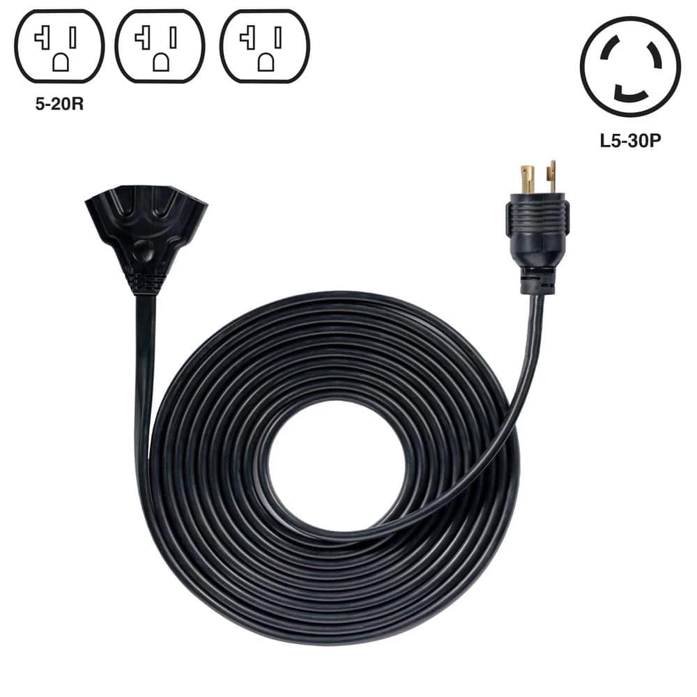 - 25 ft. 300-Volt max 30 Amp L5-30P twist lock male end with three 5-20R outlet female end