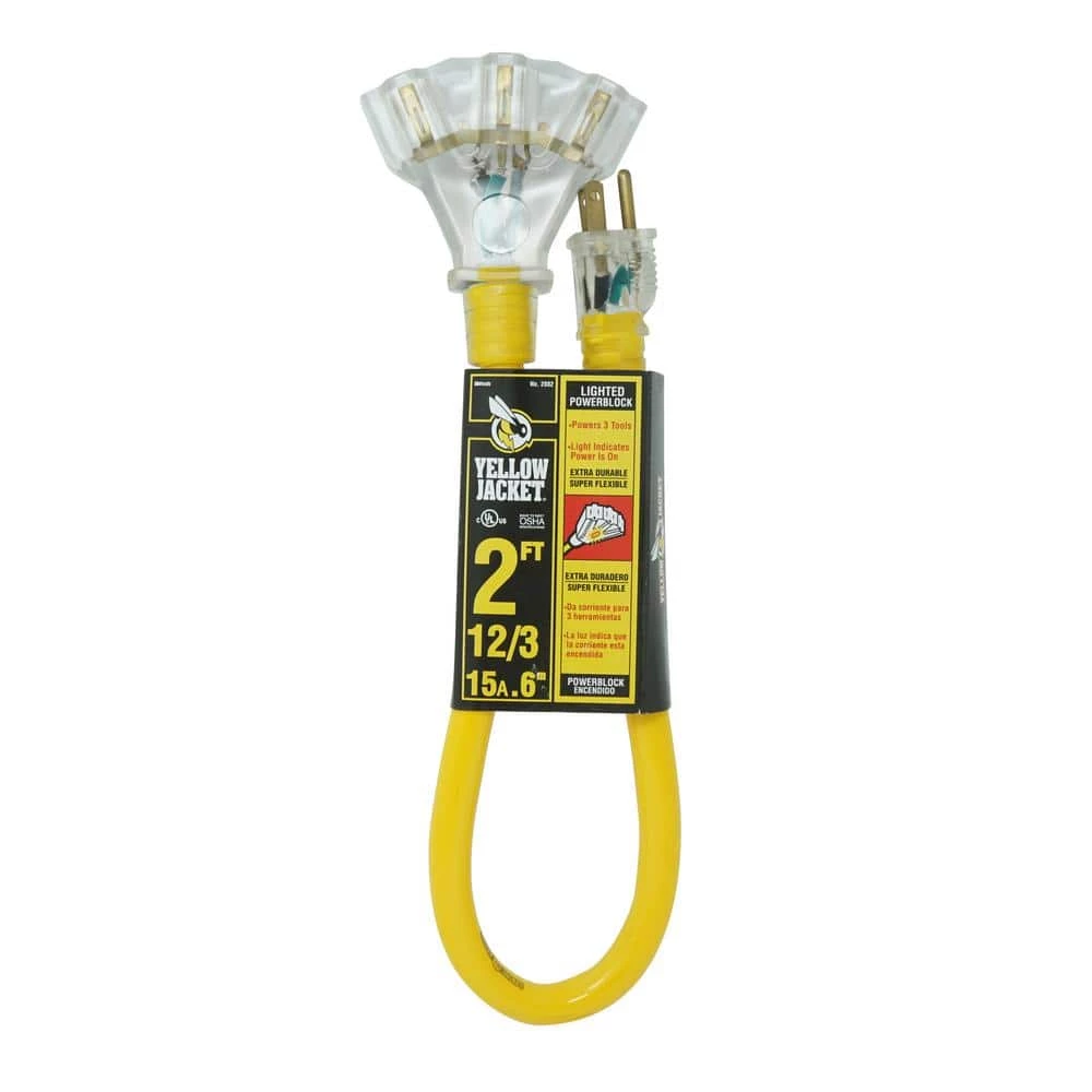 The 2 ft. Extension Cord with 3 Outlet Lighted Power Block is designed for heavy-duty applications such as powering tools and equipment. The Yellow Jacket compound is 3-times more abrasion resistant than standard vinyl, making it 1 of the toughest cords on the jobsite. This cord remains flexible in temperatures down to negative 50°C and features a clear molded 3-Outlet power block and resists extreme temperatures and rough use. The Powerlite indicator glows when the cord has power. The Yellow Jacket 2882, 2 ft. Extension Cord with 3 Outlet Power Block comes with a 1-year limited warranty that protects against defects in material and workmanship.