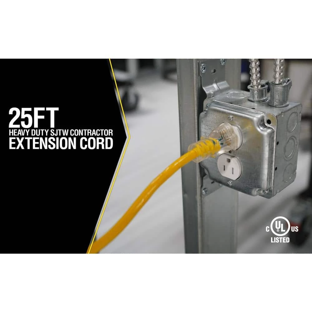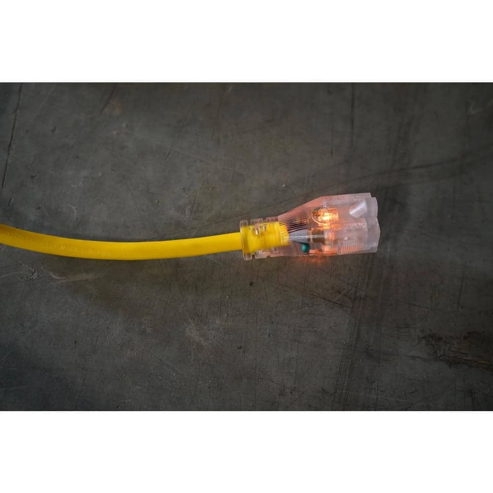 Our Yellow Jacket 12/3 25 ft. SJTW premium Lighted End Extension Cord is one of the toughest cords on the jobsite. It is more flexible and abrasion resistant at any temperature than standard vinyl compounds. The PowerLite indicator glows when the cord has power.