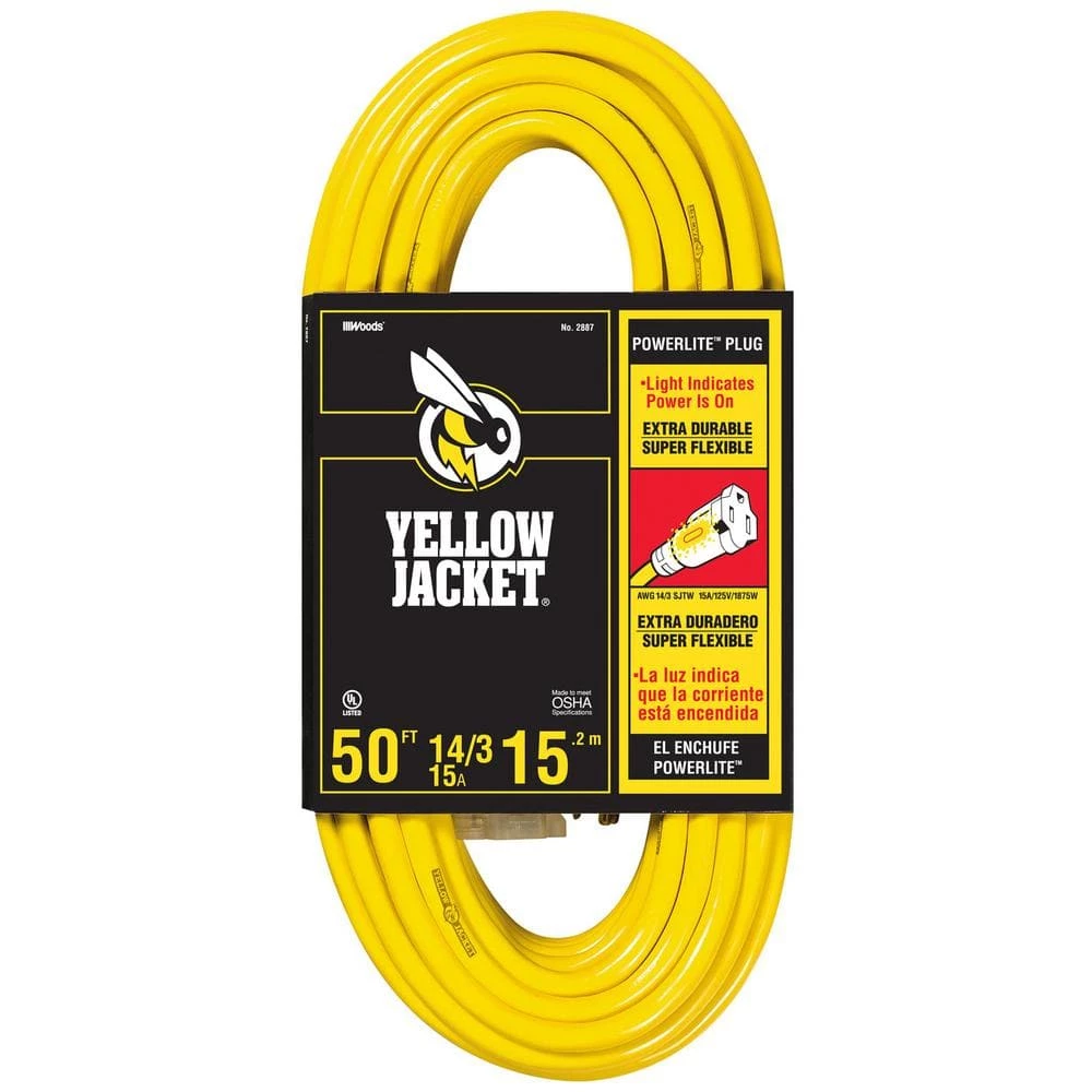 This Yellow Jacket 14/3 Heavy-Duty 13 Amp SJTW Contractor Extension Cord with Lighted Ends is 50 ft. with super flexibility in cold and hot weather. The lighted end glows when the cord has power. The extra heavy, clear molded plugs are rugged, durable and oversized. Recommended for use with heavy duty equipment and tools. Meets OSHA specifications, UL Listed.